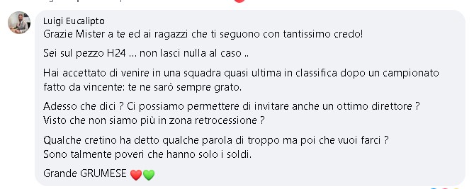 In conclusione, mentre le discussioni sui social continuano a imperversare, la Grumese sembra pronta a scrivere un nuovo capitolo della sua storia, con la speranza che le promesse di un futuro migliore si concretizzino sul campo. Le prossime settimane saranno decisive per capire se il club continuerà a marciare verso l’alto, o se dovrà affrontare nuove sfide.