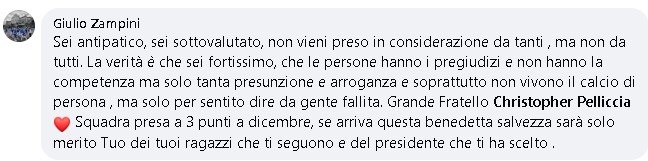 Nel suo messaggio, Zampini ha difeso con veemenza il lavoro del mister, sottolineando quanto spesso sia sottovalutato e criticato da chi non ha la competenza per riconoscerne il valore. “Sei antipatico, sei sottovalutato, non vieni preso in considerazione da tanti, ma non da tutti. La verità è che sei fortissimo,” ha scritto Zampini, esprimendo un chiaro apprezzamento per l’operato di Pelliccia. La stima nei confronti del tecnico è condivisa anche dal presidente Luigi Eucalipto, che ha elogiato il gruppo per il lavoro svolto finora e ha espresso fiducia nel futuro del club.